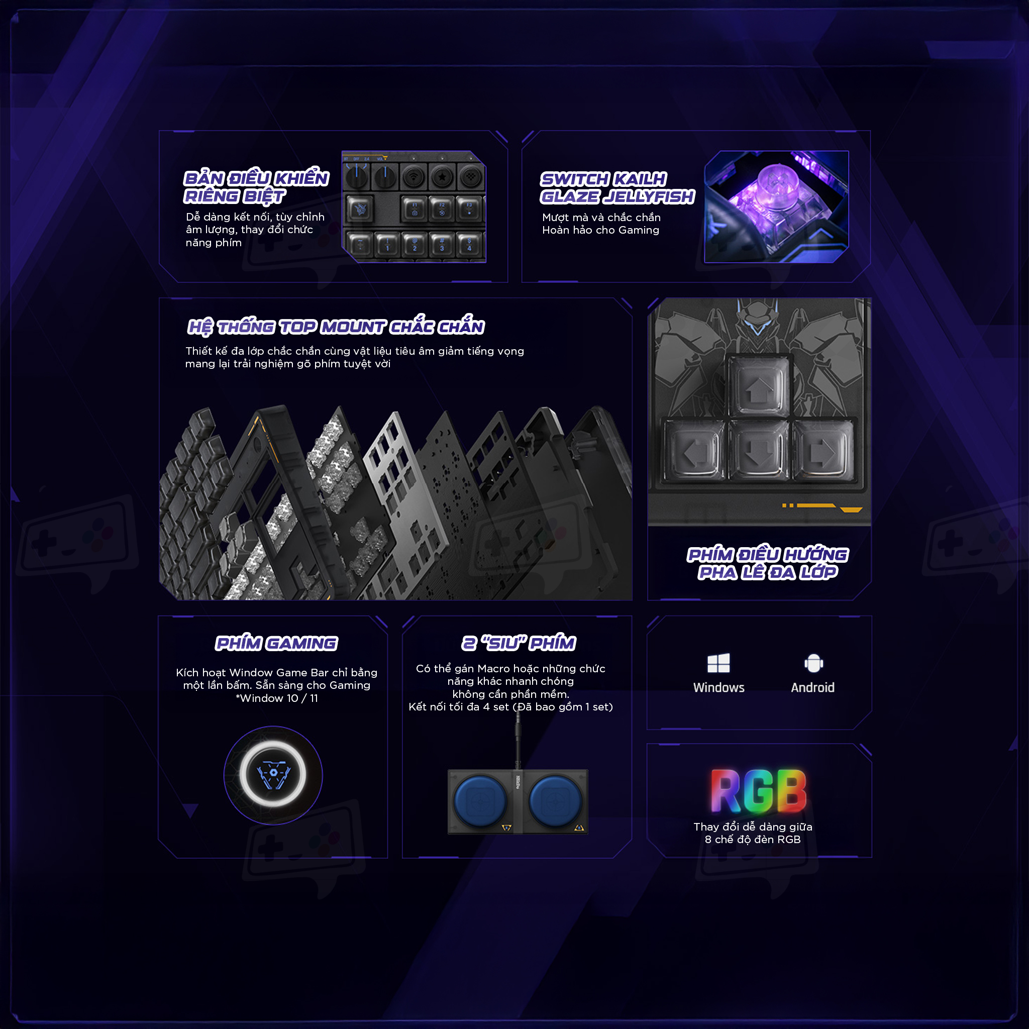 - Hỗ trợ Hot-Swap PCB, Top mount Style, N-Key Rollover.