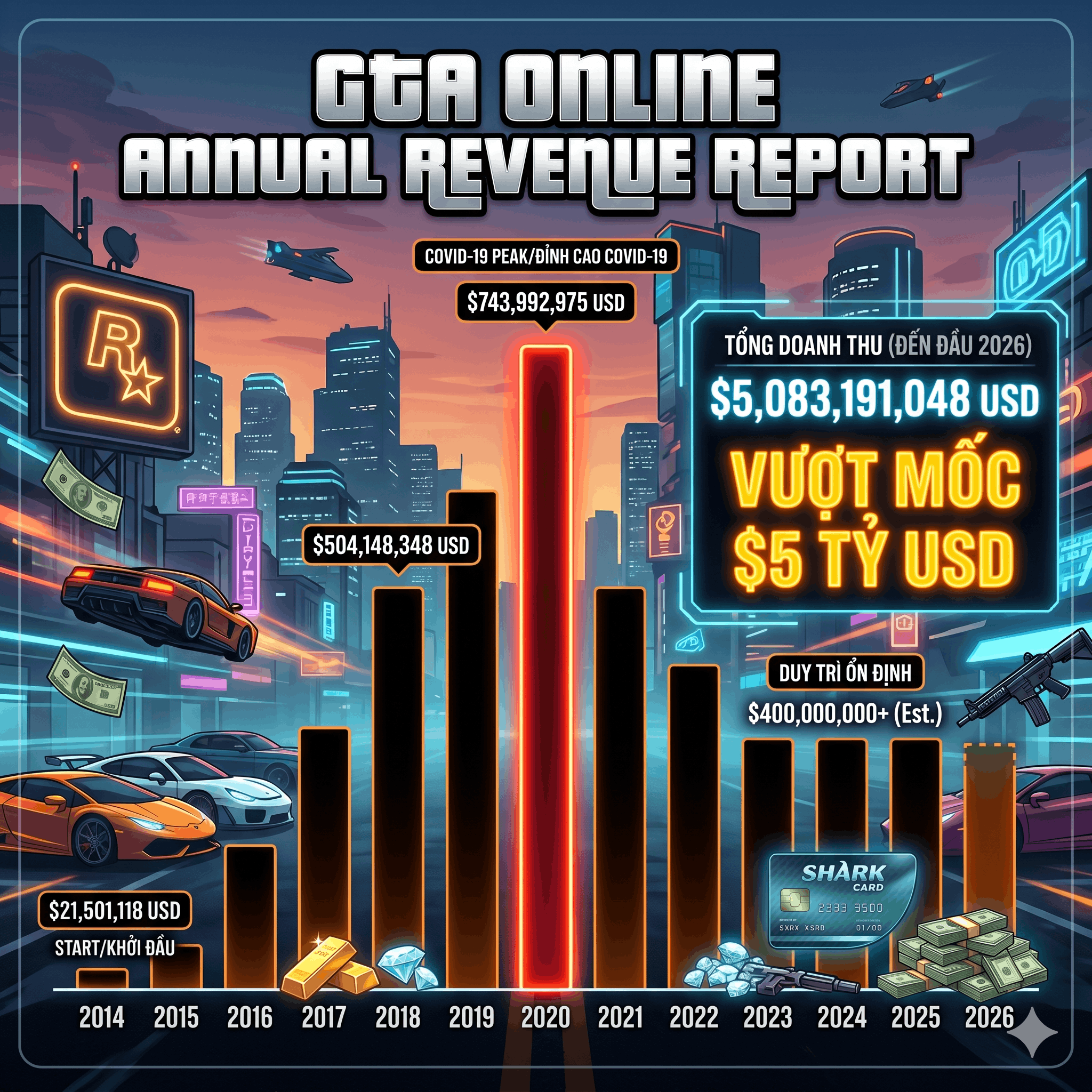 Nếu bạn thắc mắc Rockstar lấy đâu ra kinh phí "khủng" để nuôi hàng nghìn nhân sự phát triển GTA 6 trong suốt một thập kỷ, thì câu trả lời nằm ở con số 5 tỷ USD. Đây là tổng doanh thu mà GTA Online đã tích lũy được từ năm 2014 đến đầu năm 2026.